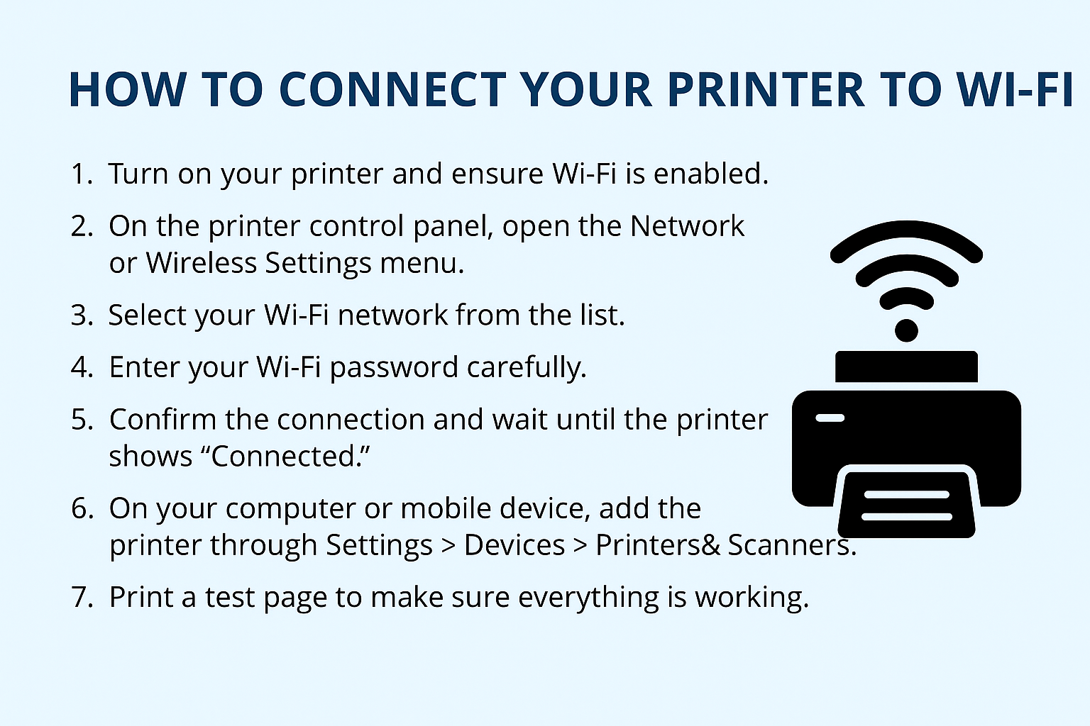 - Print a test page to confirm everything is ready.