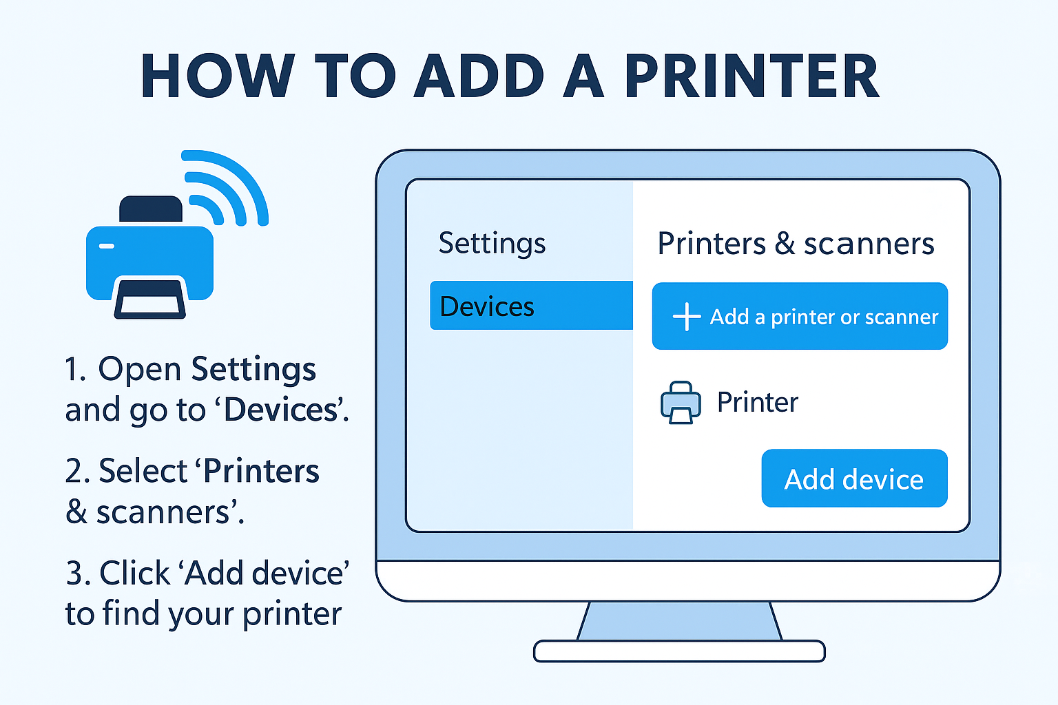 - On your computer or mobile device, add the printer through Settings > Devices > Printers & Scanners.